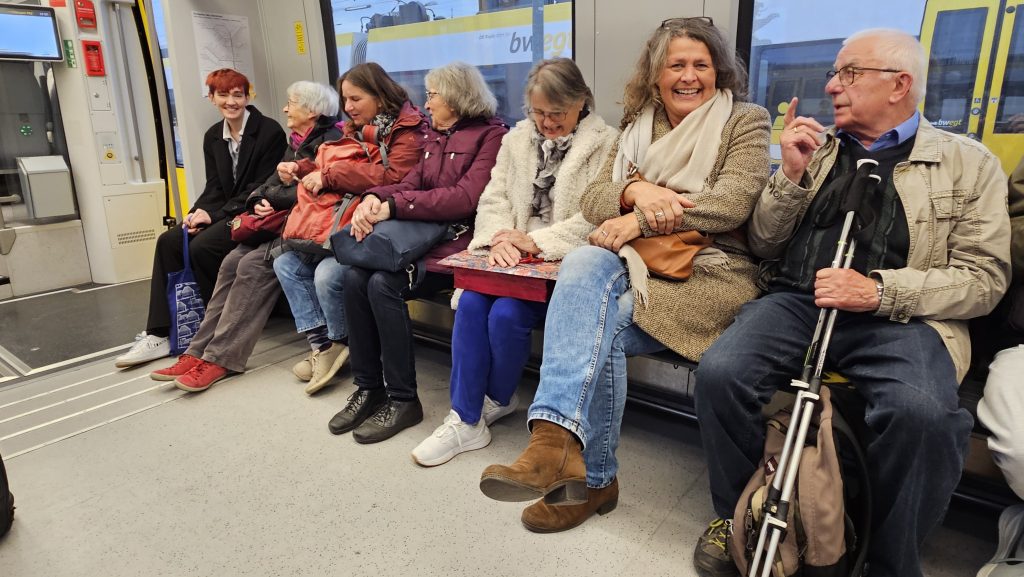 Der Exkursionstag begann und endete mit erstaunlich komplikationsfreien Zugfahrten von Bietigheim nach Hall und zurück, bei denen sich die Teilnehmenden angeregt in wechselnden Kleingruppen unterhielten.