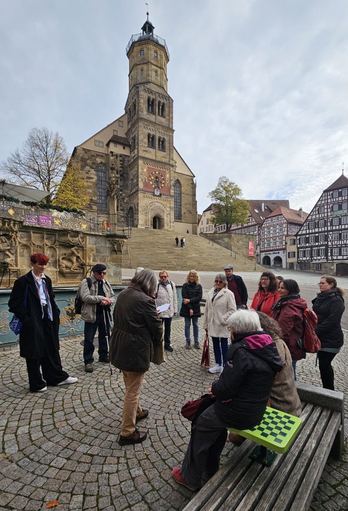 Glücklich kehrte eine kleine, aber feine Exkursionsgruppe am Sonntagabend, den 19. Oktober 2025 aus Schwäbisch Hall zurück. Hinter ihnen lag ein voller Tag in der Salzsiederstadt am Kocher – den einige Tapfere sogar noch mit einem Besuch der Stadtkirche St. Michael bzw. mit einem Museumsbesuch bei den Alten Meistern in der Johanniterkirche gekrönt hatten.