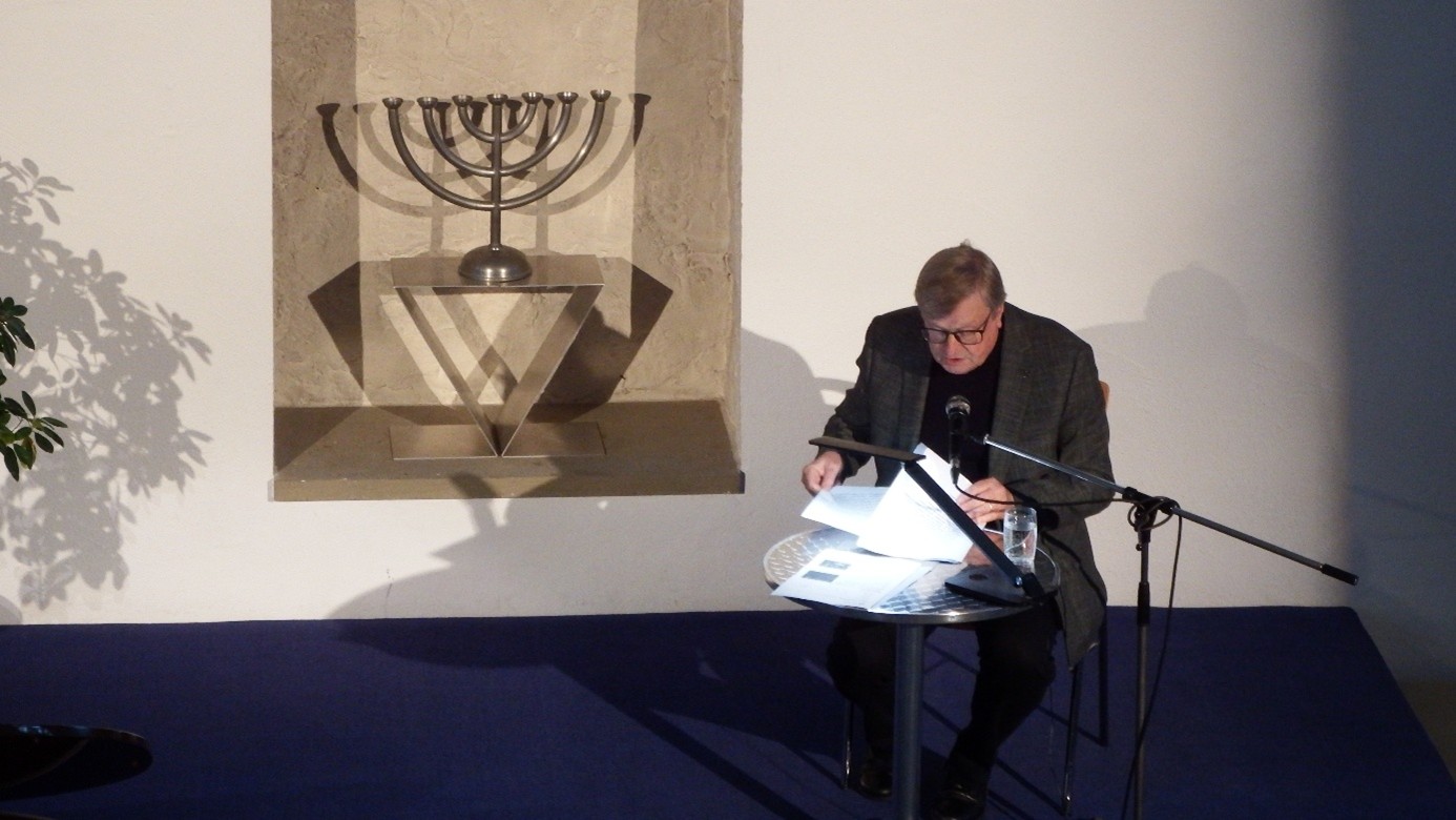Ein würdiges Gedenken an die Pogromnacht, dargeboten in einem beeindruckenden Programm! Babette Dorn hatte wunderbare Klaviermusik ausgewählt und vorgespielt, Rudolf Kurz hatte mit der Kirchentür von Langenburg, mit seinem Denkmal für das Konzentrationslager Hailfingen/Tailfingen sowie mit den Bildern vom „Heiligen Sand“ in Worms die „Bilder an der Wand“ beigefügt und Karl-Josef Kuschel verband dies alles durch seine tiefgründigen Interpretationen. Hier sind einige Gedanken zusammengefasst.